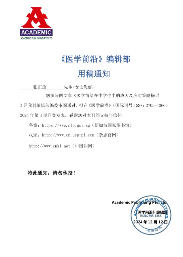 近期,成都棕南医院精神卫生中心研究团队技术骨干、彭祖贵名医工作室成员张正琼主任合作撰写的学术论文《厌学情绪在中学生中的成因及应对策略探讨》在《医学前沿》(国际刊号ISSN:2705-1366)成功发表!
