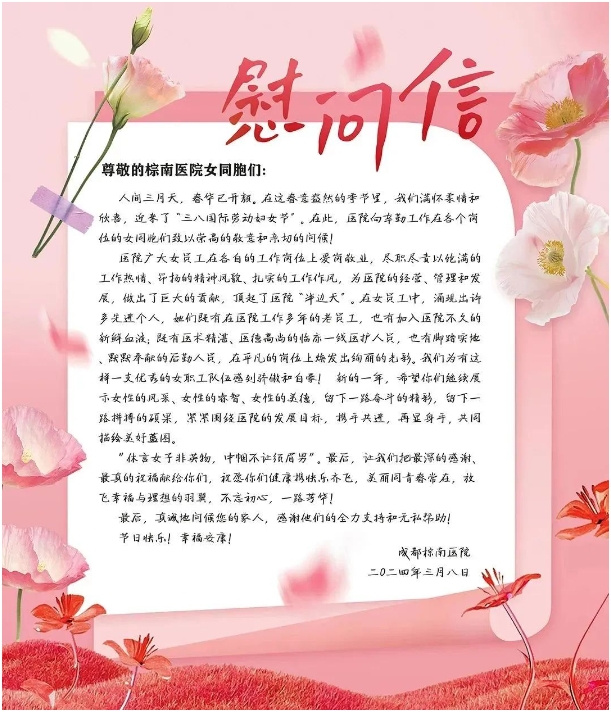 人间三月,春华开颜。值此国际劳动妇女节到来之际,成都棕南医院党支部与工会委员会精心组织了一系列职工活动,将节日的温暖与祝福送到了每一位女神的手中,柔情同庆,巾帼之日。