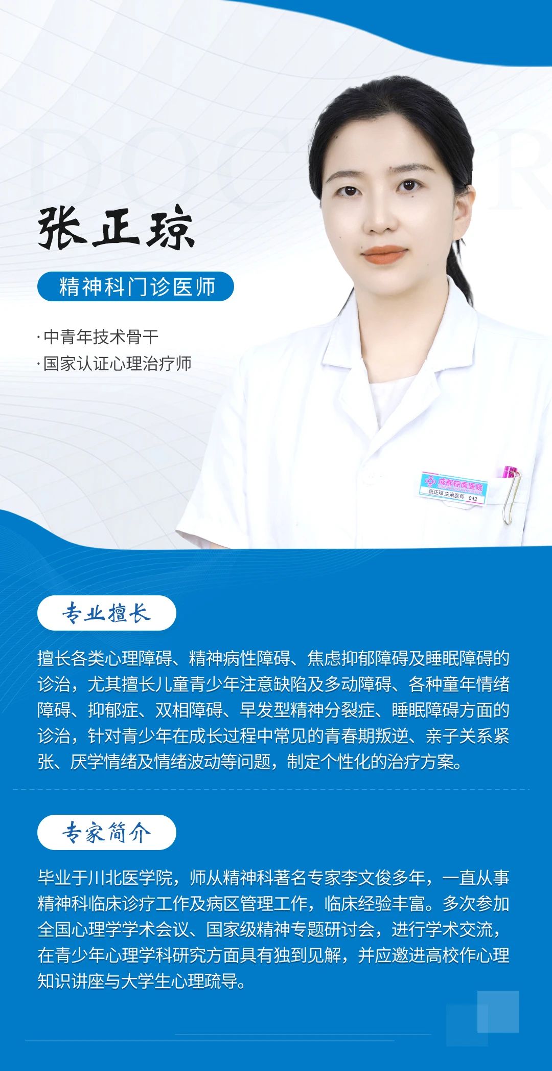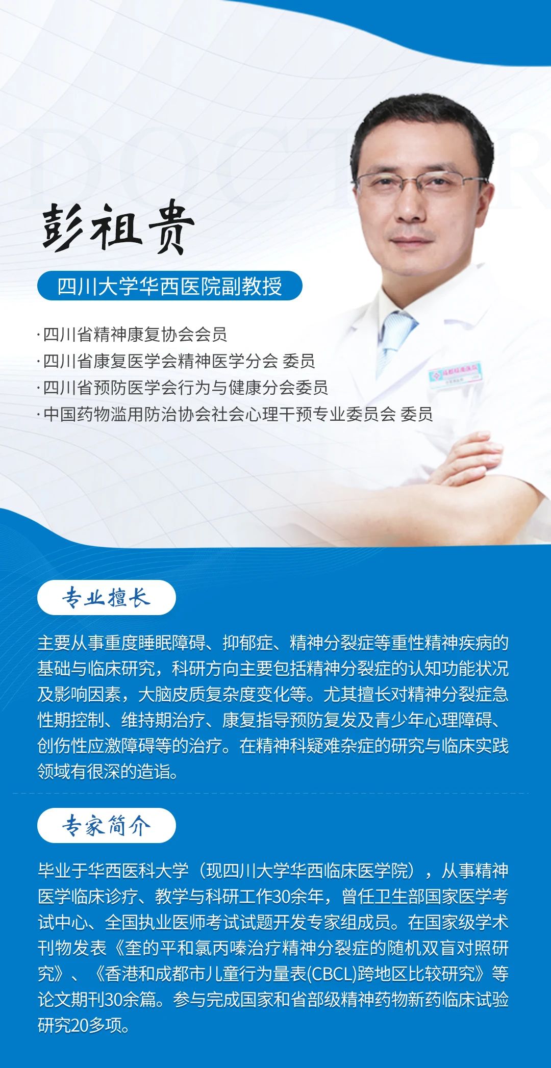为了充分发挥我院在省内精神疾病领域的突出优势,彭祖贵名医工作室由四川大学华西医院副教授彭祖贵领衔,携手成都棕南医院学科骨干张正琼、刘春艳、李明超主任,医术共融,强强联合,满足更多患者就医需求。